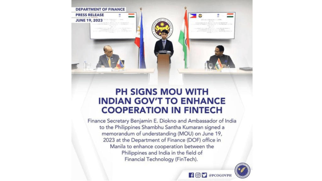 Finance Secretary Benjamin E. Diokno and Ambassador of India to the Philippines Shambhu Santha Kumaran signed a memorandum of understanding (MOU) on June 19, 2023 at the Department of Finance (DOF) office in Manila to enhance cooperation between the Philippines and India in the field of Financial Technology (FinTech).