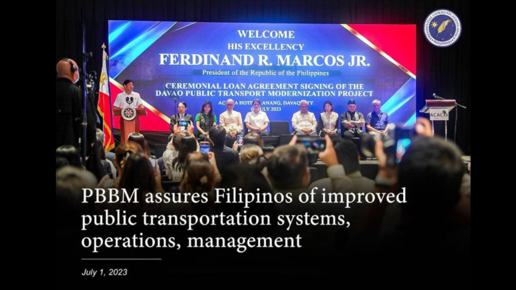 “I assure my fellow Filipinos that your government is working hard to improve the country’s transportation systems, operations, and management for the benefit of present and future generations,” President Marcos said during the ceremonial signing of a loan agreement for the Davao Public Transport Modernization Project (DPTMP) in Davao City.