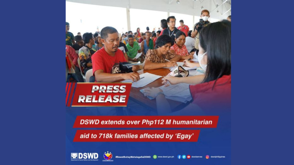 The Department of Social Welfare and Development (DSWD) reported on Monday (July 31) that it has extended more than Php112 million in resource augmentation assistance to the local government units (LGUs) affected by Super Typhoon Egay and the southwest monsoon.