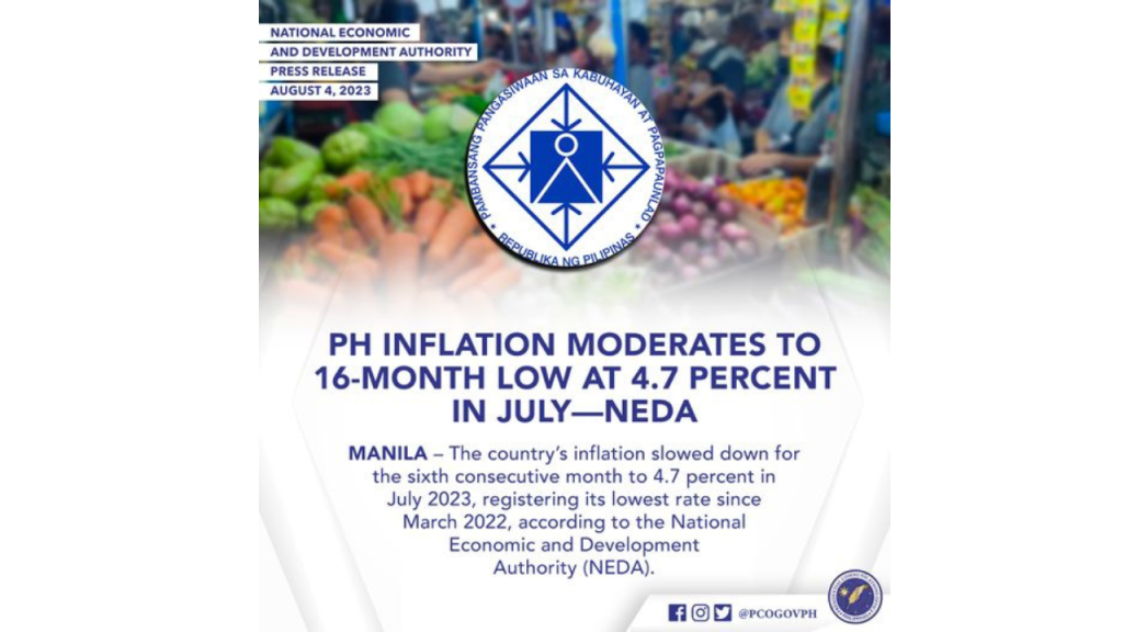The country’s inflation slowed down for the sixth consecutive month to 4.7 percent in July 2023, registering its lowest rate since March 2022, according to the National Economic and Development Authority (NEDA).