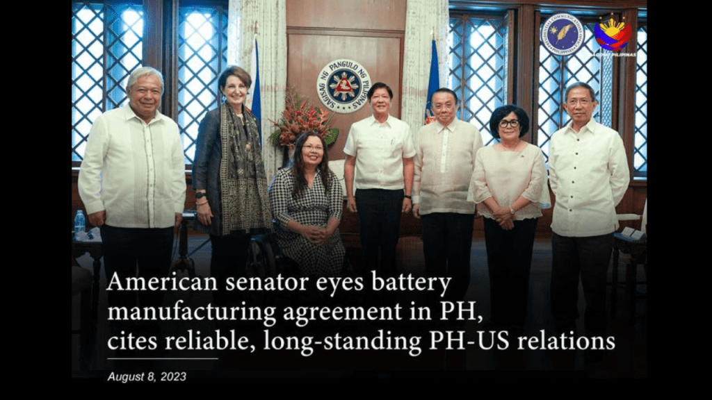 “So, for example, we’ve discussed at length about electronic vehicle batteries and we can’t get enough of them to meet the American market. And I can’t think of a better place to create a new manufacturing ecosystem for the American market than here in the Philippines where we can work together to supply that market so that we can continue to make our switch to renewables as well. And there are many other places where we can work together,” Duckworth told President Marcos.
