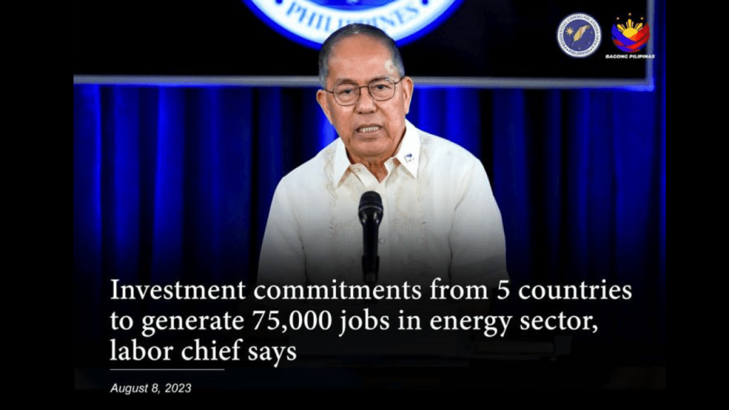 Around 75,000 jobs will be generated in the energy sector following the investment commitments of several countries as a result of President Ferdinand R. Marcos Jr.’s trips abroad, Labor Secretary Bienvenido Laguesma said on Tuesday.