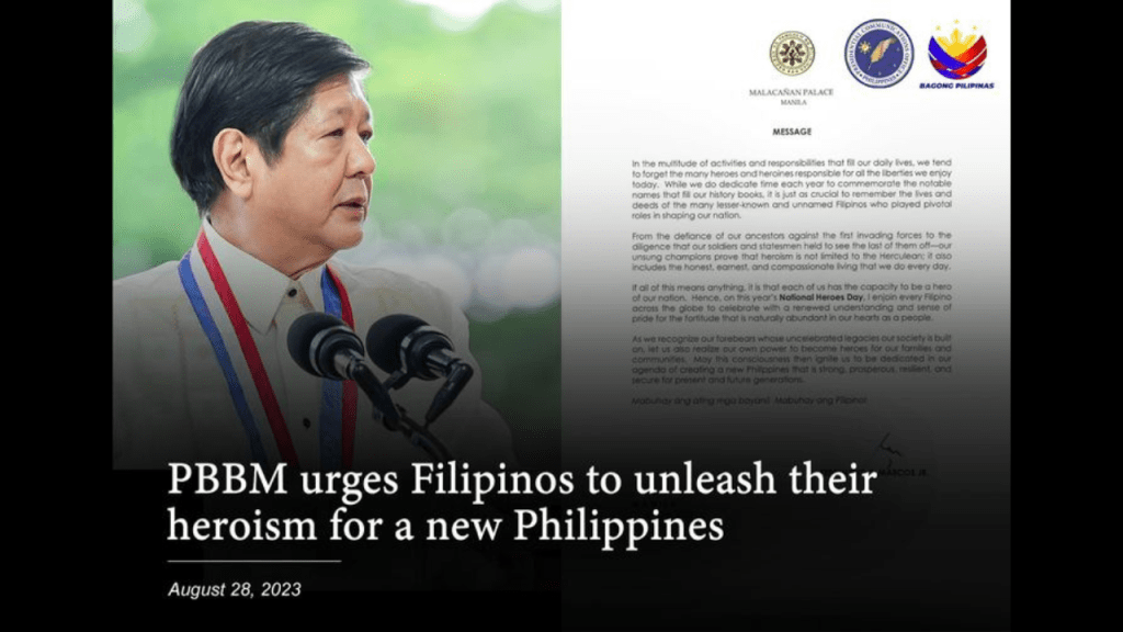 In his National Heroes Day message, President Marcos recognized the efforts not only of the most known heroes who fought for the honor and dignity that every Filipino enjoys today but also of the unsung heroes who played pivotal roles in shaping the Philippines.