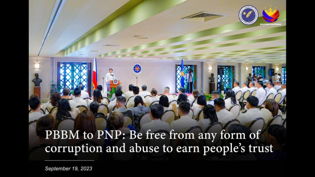 President Ferdinand R. Marcos Jr. urged the members of the Philippine National Police (PNP) on Tuesday to shun corruption and abuse so they could earn the people’s trust, as he emphasized the administration’s zero-tolerance policy for corruption and human rights abuses within the police force.