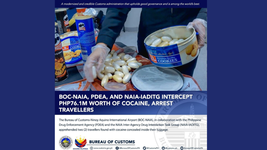 In furtherance of the strengthened campaign of the Bureau of Customs (BOC) against illegal drugs, the BOC-Ninoy Aquino International Airport (NAIA), in collaboration with the Philippine Drug Enforcement Agency (PDEA) and the NAIA Inter-Agency Drug Interdiction Task Group (NAIA-IADITG), apprehended two (2) travelers found with cocaine concealed inside their luggage.