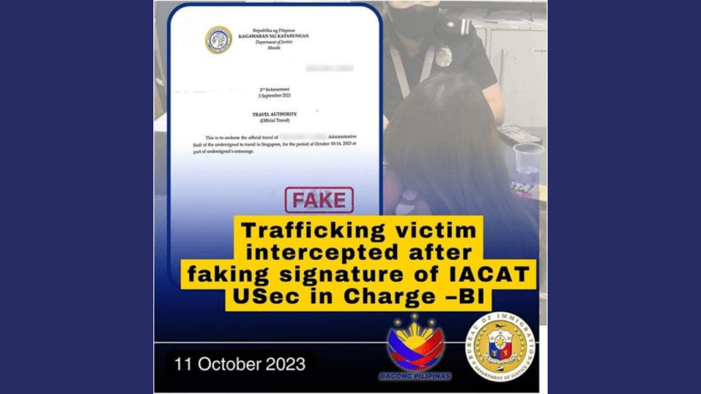 Officers of the Bureau of Immigration (BI) intercepted a female trafficking victim after she presented a document with a fake signature of a Department of Justice (DOJ) exec.