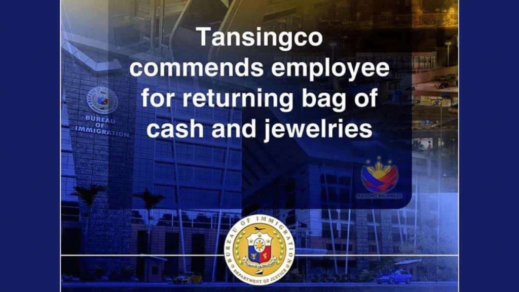 Bureau of Immigration (BI) Commissioner Norman Tansingco commended an employee for returning a bag of cash and jewelries at the Mactan-Cebu International Airport.