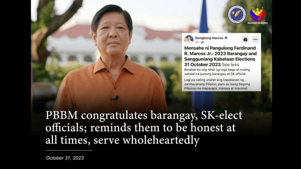 President Ferdinand R. Marcos Jr. congratulated the newly elected and re-elected barangay and Sangguniang Kabataan (SK) officials in the recently concluded elections on Monday as he reminded them to be honest at all times and to serve their constituents.