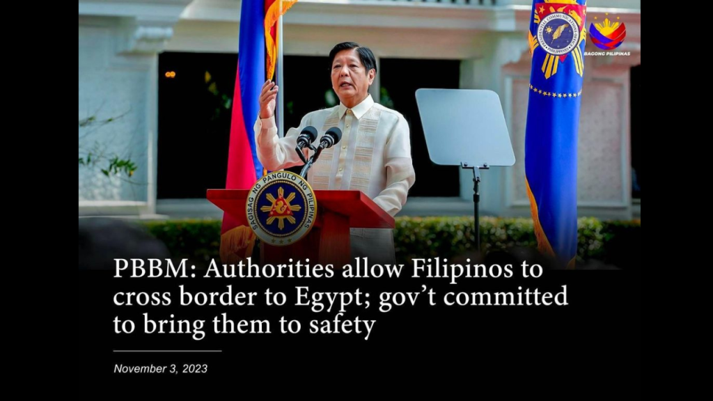 The Israeli government assured the Philippines that it would allow Filipinos to pass the Rafah Crossing going to Egypt, President Ferdinand R. Marcos Jr. said on Friday as he assured the Philippine government’s readiness to bring Filipinos out of the war zone.