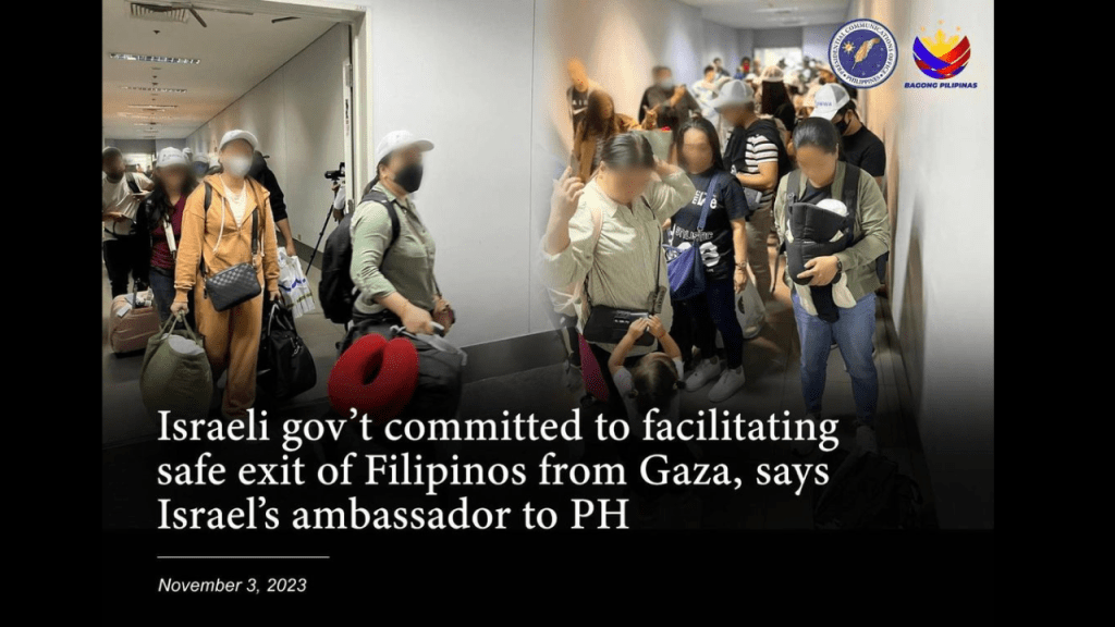 “We had a phone call yesterday between our ministers and we have different communication lines between Israel and the Philippines, close countries, friendly relations, and we’ve seen also they’ve voted, the Philippines in the United Nations. And we will do everything from our part in order to facilitate the safe exit of Filipinos that are in Gaza,” Fluss said during a press briefing facilitated by the Israeli Embassy in Manila via Zoom.