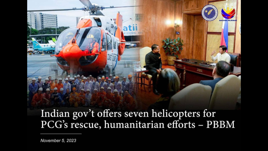 President Ferdinand R. Marcos Jr. said that India’s offer to provide helicopters to the PCG will be a big help to the Philippine government’s efforts to build up the country’s capabilities in terms of rescue and humanitarian efforts.