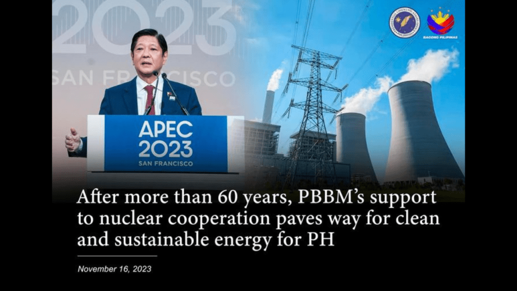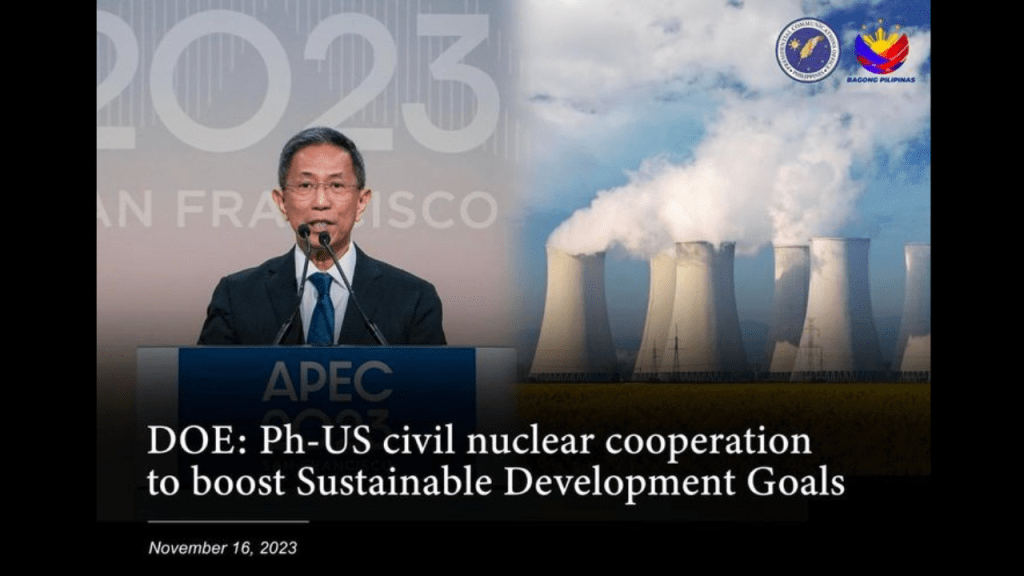 He said that the 123 Agreement signed during the Asia-Pacific Economic Cooperation (APEC) Leaders’ Week in San Francisco, California, allows the peaceful transfer of nuclear material, equipment, and knowledge from the US to the Philippines.