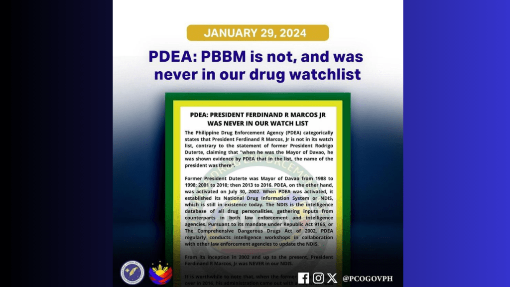 “Based on all the foregoing facts, the PDEA asserts that President Marcos Jr. is not and was never in its watchlist,” the PDEA said in a statement, contradicting Duterte who claimed that the agency showed him evidence, showing Marcos’ name in the supposed drug list.