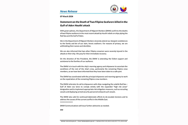 Meantime, senior officials of the DMW met directly with the family and kin of the two Filipino seafarers who died in the attack.