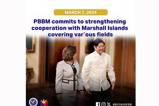President Ferdinand R. Marcos Jr. on Thursday reaffirmed the Philippines’ commitment to strengthen bilateral cooperation with the Republic of the Marshall Islands (RMI) after President Hilda C. Heine asked for increased collaboration in various areas such as labor, education and skills training, and agricultural production.