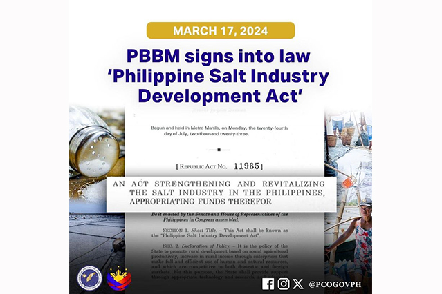 President Ferdinand R. Marcos Jr. has signed into law the “Philippine Salt Industry Development Act,” which aims to strengthen and revitalize the salt industry in the Philippines as part of the administration’s efforts to promote rural development and increase rural income.