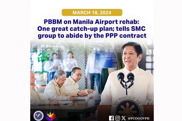 President Ferdinand R. Marcos Jr. considered the rehabilitation of the Manila International Airport (MIA) as a great catch-up plan, urging the San Miguel Corp. and its consortium to abide by the contract stated under the Public-Private Partnership (PPP).