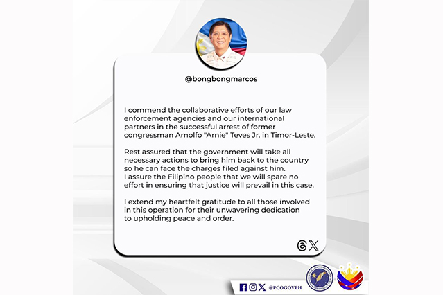 “I commend the collaborative efforts of our law enforcement agencies and our international partners in the successful arrest of former congressman Arnolfo “Arnie” Teves Jr. in Timor-Leste,” President Marcos said.