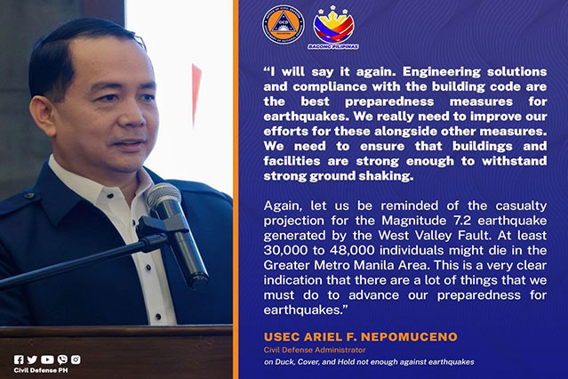 Office of Civil Defense Administrator, Undersecretary Ariel Nepomuceno on Saturday reiterated the importance of strengthening engineering solutions and building code compliance in preparation for earthquakes, especially for the “Big Ones.”