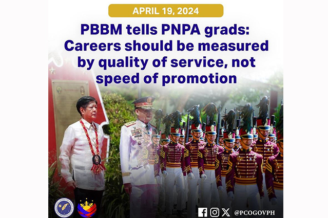 President Ferdinand R. Marcos Jr. reminded on Friday this year’s Philippine National Police Academy’s (PNPA) graduates that their careers should not be measured by the speed of their promotions but by the quality of their service to the people.