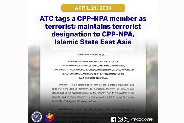 The Anti-Terrorism Council (ATC) has named Elizabeth Pineda Principe, a member of the Communist Party of the Philippines and the New People’s Army (CPP-NPA), as a terrorist.