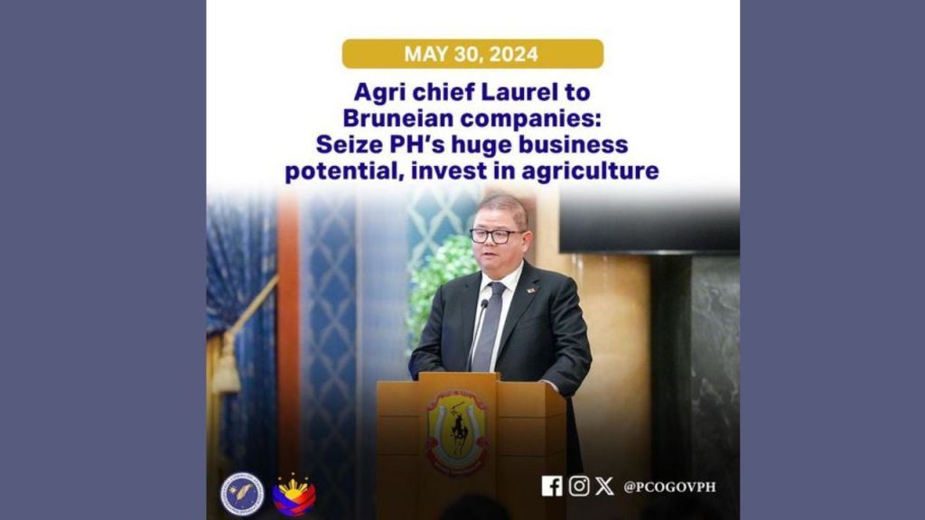 Agriculture Secretary Francisco Tiu Laurel Jr. pitched for the Philippines’ agriculture sector on Wednesday, inviting Bruneian companies and business organizations to invest in the Philippines over other locations considering its huge business potential.