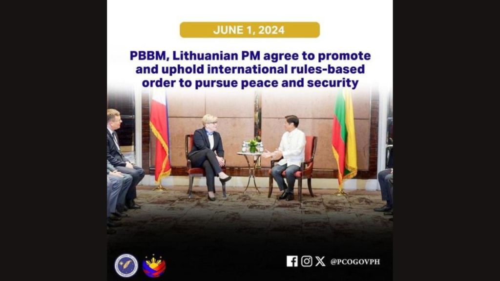 President Ferdinand R. Marcos Jr. and Lithuanian Prime Minister Ingrida Šimonyte on Friday agreed to uphold international rules-based order in the pursuit of peace and security.