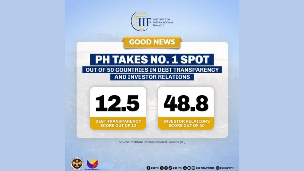 The Philippines has secured the top position out of 50 countries in a ranking of debt transparency and investor relations compiled by the Institute of International Finance (IIF).