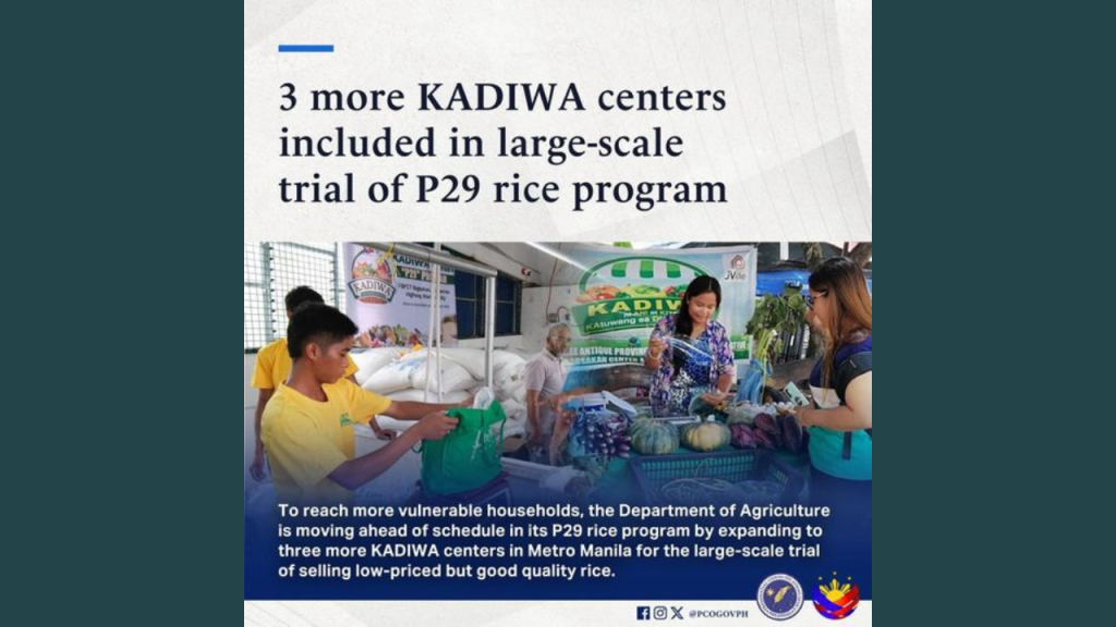 The Department of Agriculture is moving ahead of schedule in its P29 rice program, expanding to three more KADIWA centers in Metro Manila the large-scale trial of selling low-priced but good quality rice to reach more vulnerable households.