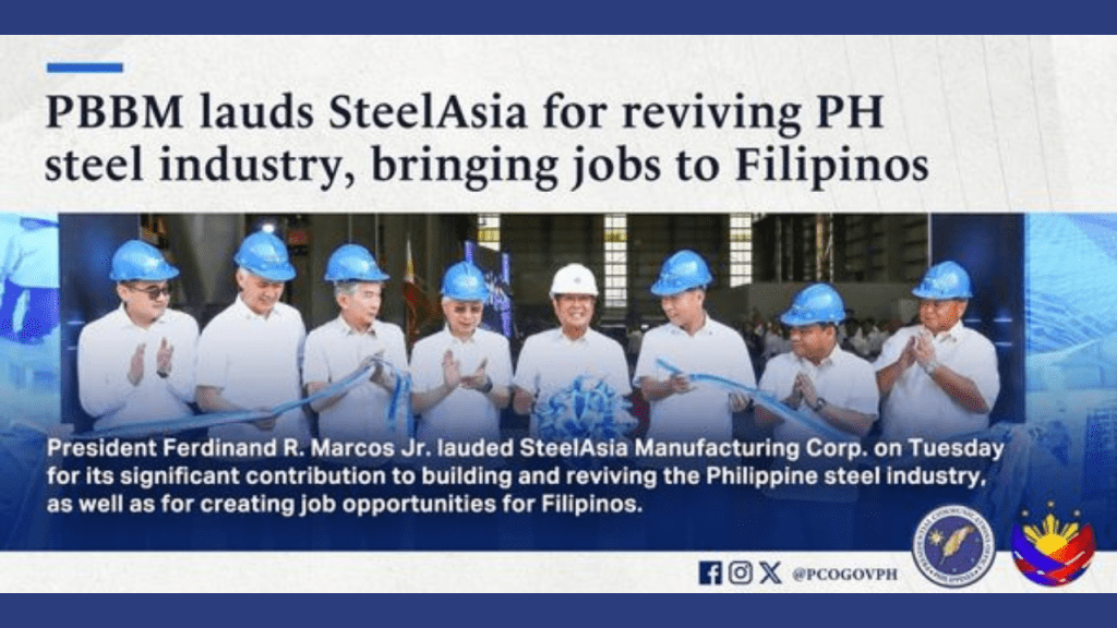 President Ferdinand R. Marcos Jr. lauded on Tuesday the SteelAsia Manufacturing Corp. for playing a significant contribution to the goal of building and reviving the Philippine steel industry and for bringing job opportunities to Filipinos.