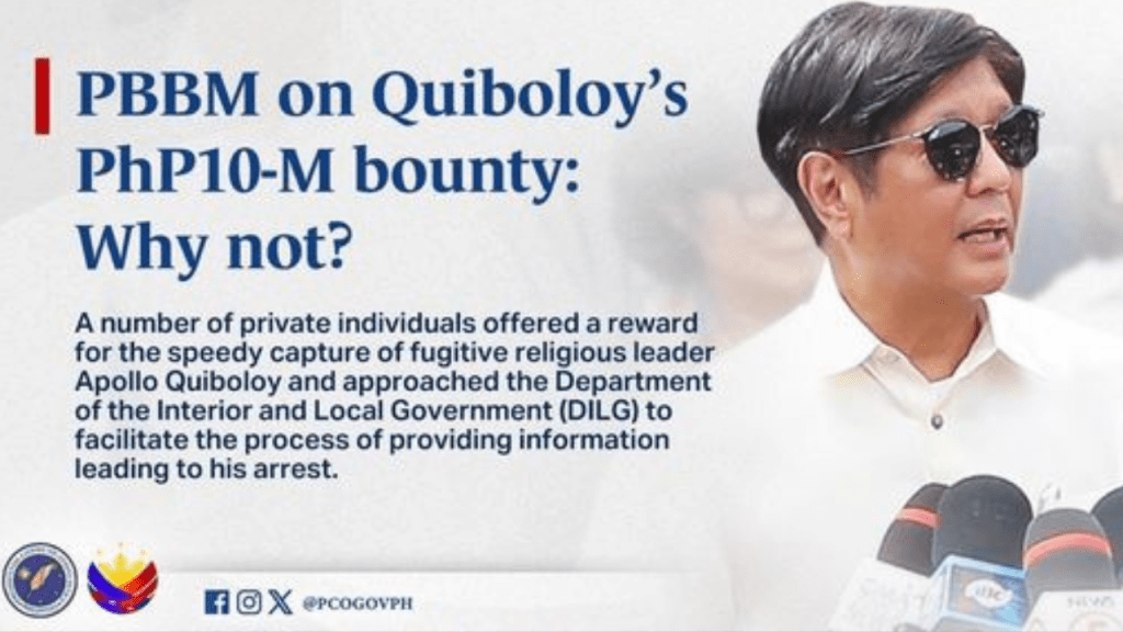 President Ferdinand R. Marcos Jr. found nothing wrong with the P10 million being offered as reward for anybody who can provide information on the whereabouts of fugitive religious leader Apollo Quiboloy.