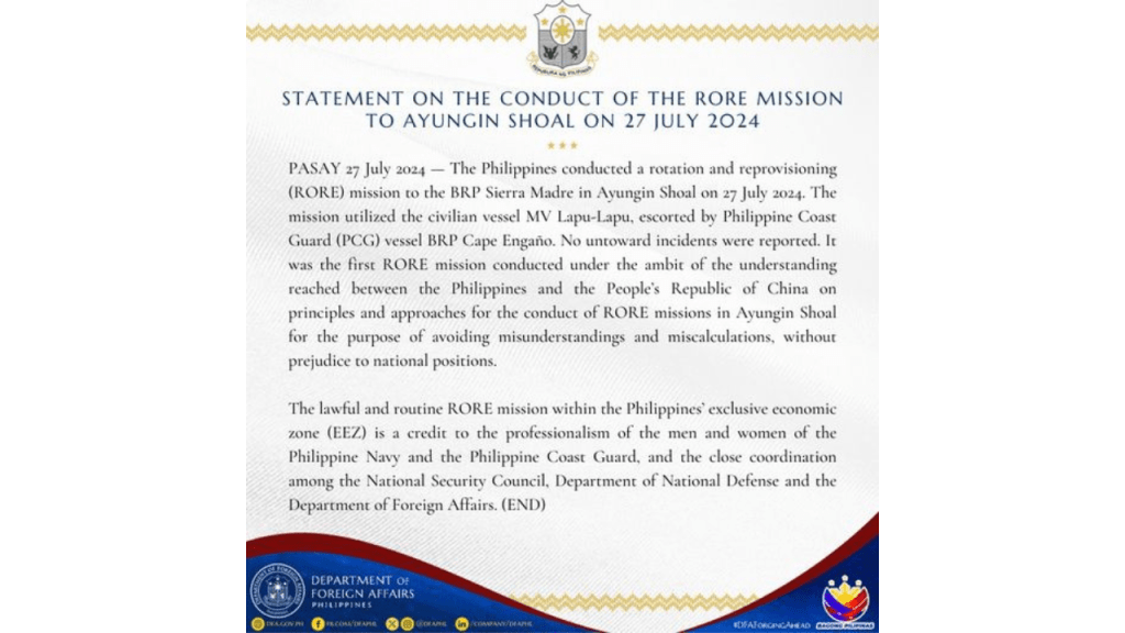 PASAY 27 July 2024 – The Philippines conducted a rotation and reprovisioning (RORE) mission to the BRP Sierra Madre in Ayungin Shoal on 27 July 2024. The mission utilized the civilian vessel MV Lapu-Lapu, escorted by Philippine Coast Guard (PCG) vessel BRP Cape Engaño. No untoward incidents were reported.