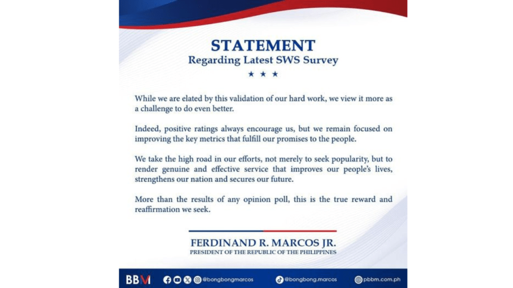 “While we are elated by this validation of our hard work, we view it more as a challenge to do even better,” President Marcos said in a statement, referring to his “very good” rating from the latest Social Weather Station (SWS) survey.