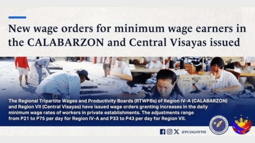 The Regional Tripartite Wages and Productivity Boards (RTWPBs) of Region IV-A (CALABARZON) and Region VII (Central Visayas) have issued wage orders granting increases in the daily minimum wage rates of workers in private establishments. The adjustments range from P21 to P75 per day for Region IV-A and P33 to P43 per day for Region VII. Both adjustments were reached through consensus and unanimously approved by the government, labor and employer representatives in both RTWPBS, and have likewise been unanimously affirmed by the National Wages and Productivity Commission (NWPC).