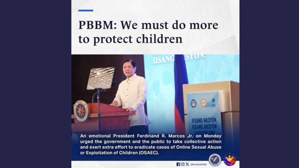 In his speech during the “Iisang Nasyon, Iisang Aksyon: Tapusin ang Online Sexual Abuse or Exploitation of Children (OSAEC) Ngayon Summit 2024” in Makati City, President Marcos emphasized the need for the government to strengthen its efforts against the sexual exploitation of children online.