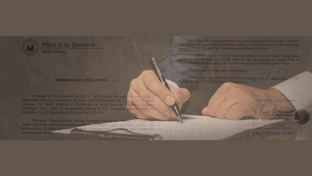 Malacañang issued Memorandum Circular (MC) No. 64 on Wednesday, suspending work in government offices under the Executive branch from 3:00 p.m. onwards on Monday, September 23, in observance of National Family Week.