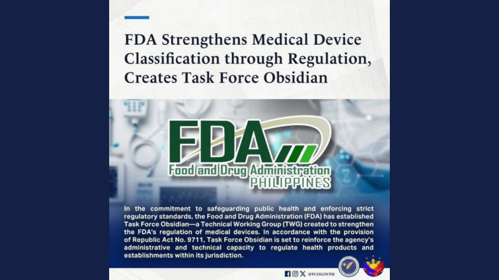 In the commitment to safeguarding public health and enforcing strict regulatory standards, the Food and Drug Administration (FDA) has established Task Force Obsidian—a Technical Working Group (TWG) created to strengthen the FDA’s regulation of medical devices. In accordance with the provision of Republic Act No. 9711, Task Force Obsidian is set to reinforce the agency’s administrative and technical capacity to regulate health products and establishments within its jurisdiction.