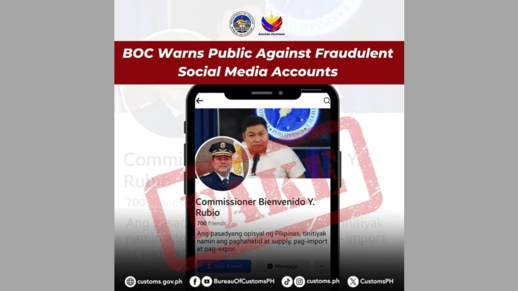 The Bureau of Customs (BOC) alerts the public regarding fraudulent social media accounts using illegally obtained photos of the Commissioner of Customs and making false pretenses and representations. These unauthorized accounts are misleading individuals by requesting money for customs-related activities, deceiving them into believing that these are legitimate transactions.
