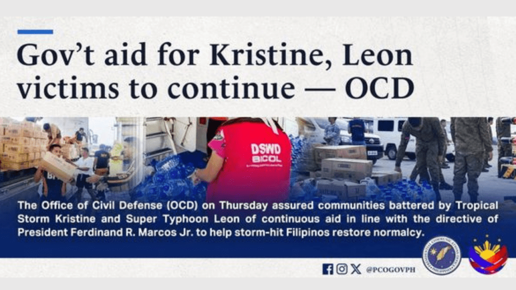 The Office of Civil Defense (OCD) on Thursday assured communities battered by Tropical Storm Kristine and Super Typhoon Leon of continuous aid in line with the directive of President Ferdinand R. Marcos Jr. to help storm-hit Filipinos restore normalcy.