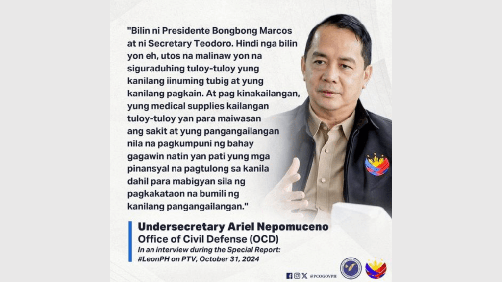 “Handa naman ang pamahalaan kasi nakalatag ang mga programs ng gobyerno bago dumating o pag dumating na ‘yung bagyo. Kahit na ang dinadanas natin at ang dinanas natin [ay] talaga namang malawak na kalamidad, maaasahan n’yo ang pamahalaan natin sa pagtutulungan ng lahat ng ahensya ng gobyerno,” OCD Undersecretary Ariel Nepomuceno said over PTV-4.