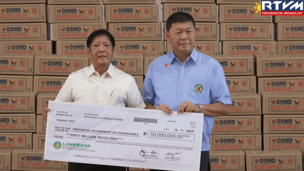 President Ferdinand R. Marcos Jr. on Tuesday handed over PhP50 million to the provincial government of Catanduanes for its immediate recovery from the impact of Super Typhoon Pepito.