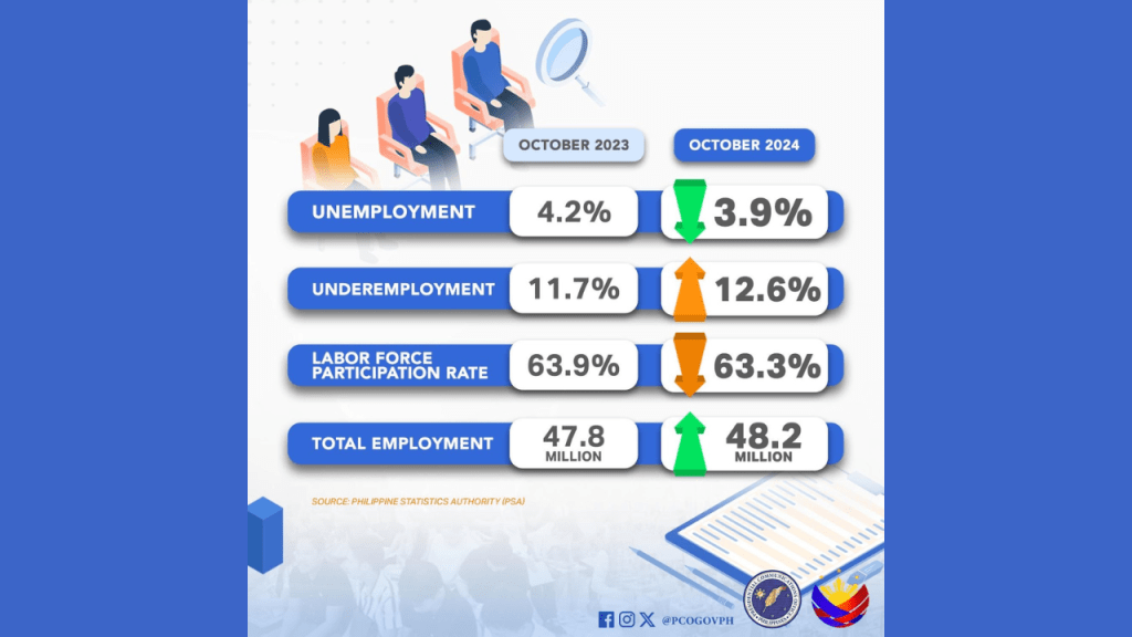 The latest Labor Force Survey of the Philippine Statistics Authority (PSA) showed that the national unemployment rate in October 2024 dropped to 3.9 percent from 4.2 percent in October 2023. This reduction brings the full-year figure down to 4.3 percent from 4.6 percent, better than the 2024 target set by the Philippine Development Plan of 4.4 to 4.7 percent.