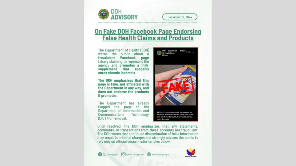 The Department of Health (DOH) warns the public about a fraudulent Facebook page falsely claiming to represent the agency and *promotes a milk supplement that allegedly cures chronic insomnia.