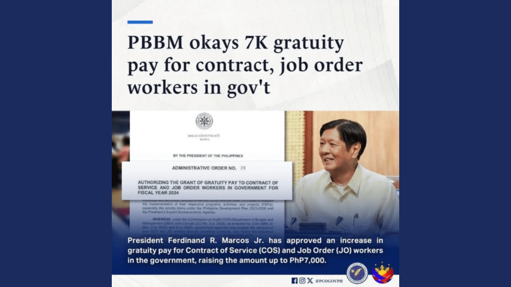 President Ferdinand R. Marcos Jr. has approved an increase in gratuity pay for Contract of Service (COS) and Job Order (JO) workers in the government, raising the amount up to PhP7,000.