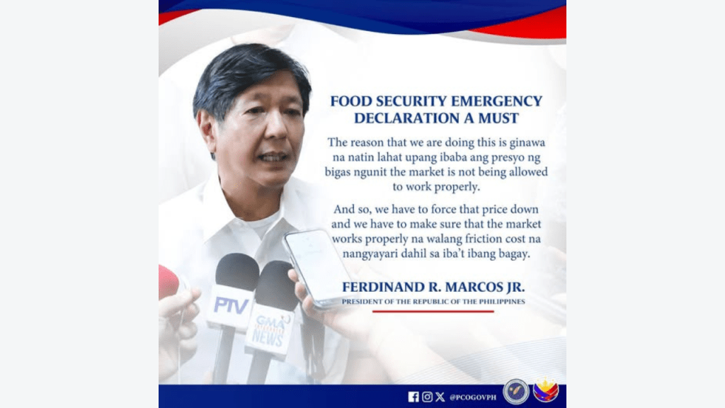 A declaration of food security emergency is needed for the market to work properly amid the rising prices of rice, President Ferdinand R. Marcos Jr. said Friday.