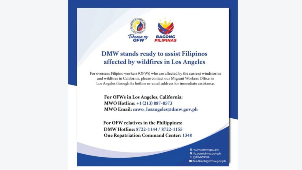 For OFWs who are affected by the current windstorms and wildfires in California, please contact the DMW-MWO in LA through its hotline or email address for immediate assistance.