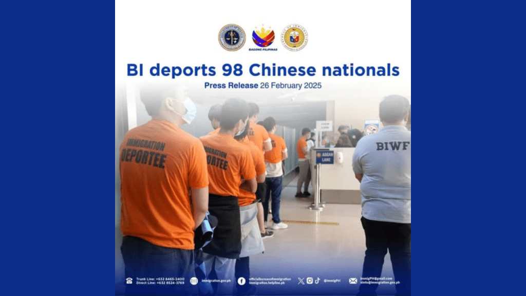 The Bureau of Immigration (BI) successfully deported a total of 98 Chinese nationals after being caught working under an illegal POGO company, in line with the government’s ongoing crackdown on illegal offshore gaming operations.